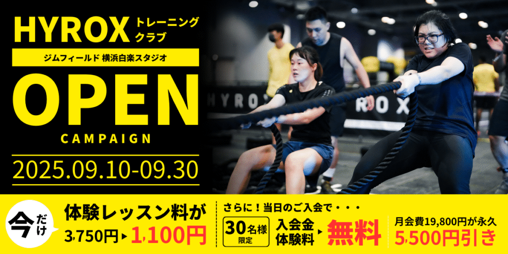 通常3,750円のジムフィールド横浜白楽店でのHYROXトレーニング体験レッスン料が、期間限定で今だけ1,100円に!!